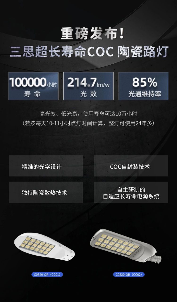 近日,全球?qū)I(yè)LED照明及系統(tǒng)集成解決方案提供商——上海三思電子工程有限公司(以下簡稱“上海三思”)正式發(fā)布兩款超長壽命COC陶瓷路燈C0820-QR(CC01)和C0820-QR(CC02)系列。