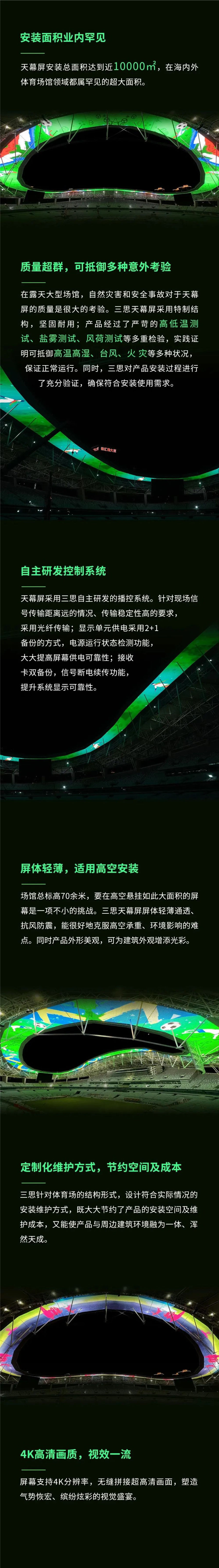 此次三思為上海體育場打造的10000㎡天幕屏,可謂“巨無霸”級別。巨大的屏體沿建筑輪廓而設(shè)計,每至夜幕降臨、屏幕亮起,其宛若一條騰躍起舞的蛟龍,在場館上空游走,與深邃天空相輝映,與綠茵草地同閃耀。