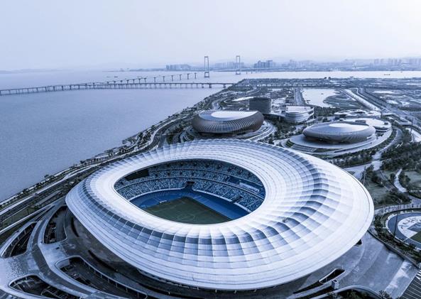 近日,位于廣州南沙萬頃沙二十一涌、毗鄰伶仃洋畔的大灣區(qū)文化體育中心成為焦點。作為集文化、旅游、體育、國防教育等功能于一體的大型城市綜合體,其總體規(guī)劃秉持“扇迎八方客,明珠耀九州”理念,從高空俯瞰,三座體育場館呈C字形布局面向大海,仿佛在熱情擁抱整個粵港澳大灣區(qū)。這三座場館分別為6萬座的綜合體育場、2萬座的綜合體育館以及4千座的游泳跳水館。