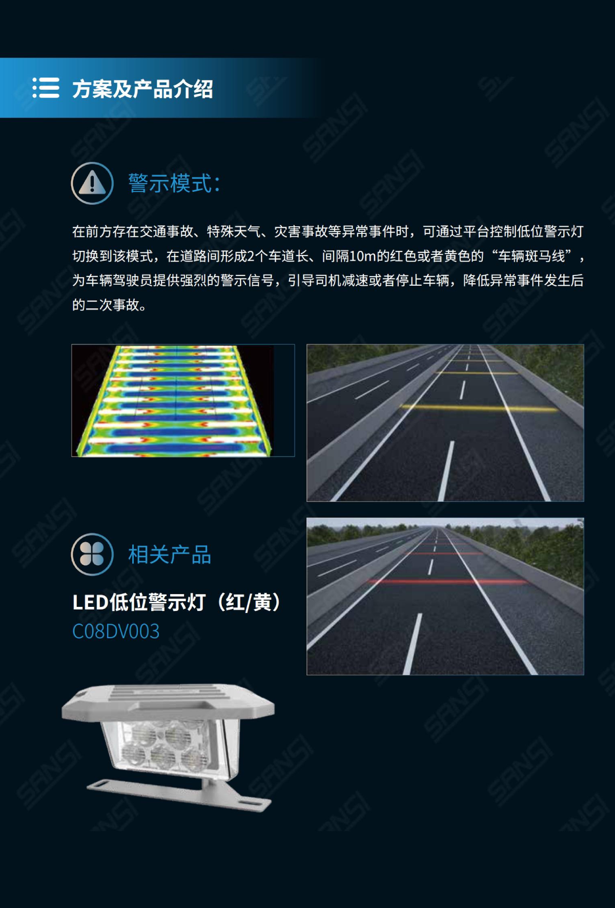 二合一燈具方案,通過(guò)集中控制箱和平臺(tái)可遠(yuǎn)程手動(dòng)/自動(dòng)的控制照明燈的亮滅及誘導(dǎo)燈的閃爍頻率,提供清晰的視線引導(dǎo)。燈具采用獨(dú)特設(shè)計(jì)和配光技術(shù),避免眩光干擾,減少視覺(jué)疲勞,同時(shí)確保路面照明均勻,消除斑馬線現(xiàn)象,保障行車安全。